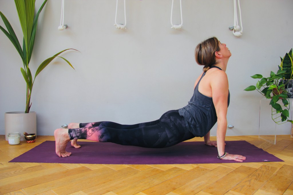 For women who feel low and lacking in energy during menopause, the more invigorating yoga poses will be of greater benefit. In fact, all women who are suffering with tiredness from lack of sleep or insomnia will benefit from a more active yoga practice in the mornings. This will help to regulate energy levels through the day and will also induce deeper sleep at night. It is also beneficial to get outside in the morning light and move your body early in the day when the muscles feel stiffer. A sun salutation or some backbends will increase energy and resilience. Backbends also stimulate the adrenal glands, which regulate stress hormones and also become a primary source of oestrogen production both during and post menopause. Urdhva Mukha Svanasana (below) is a backbend pose that opens the chest to release energy and may even increase libido.